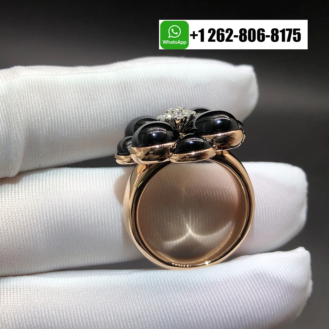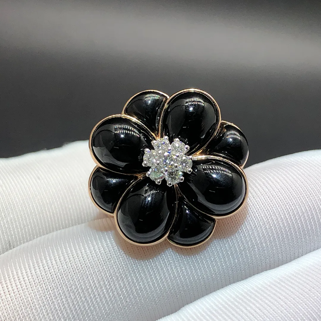 This exquisite Van Cleef & Arpels Floral Onyx & Diamonds 18k Rose Gold Flower Ring features radiant, polished onyx petals beautifully contrasted by a brilliant cluster of sparkling diamonds at its heart. Set in warm 18k rose gold, the piece gains a soft, romantic glow that enhances its sculptural elegance. Artful and expressive, it celebrates the maison’s mastery in transforming nature’s poetry into a timeless statement of refined luxury.