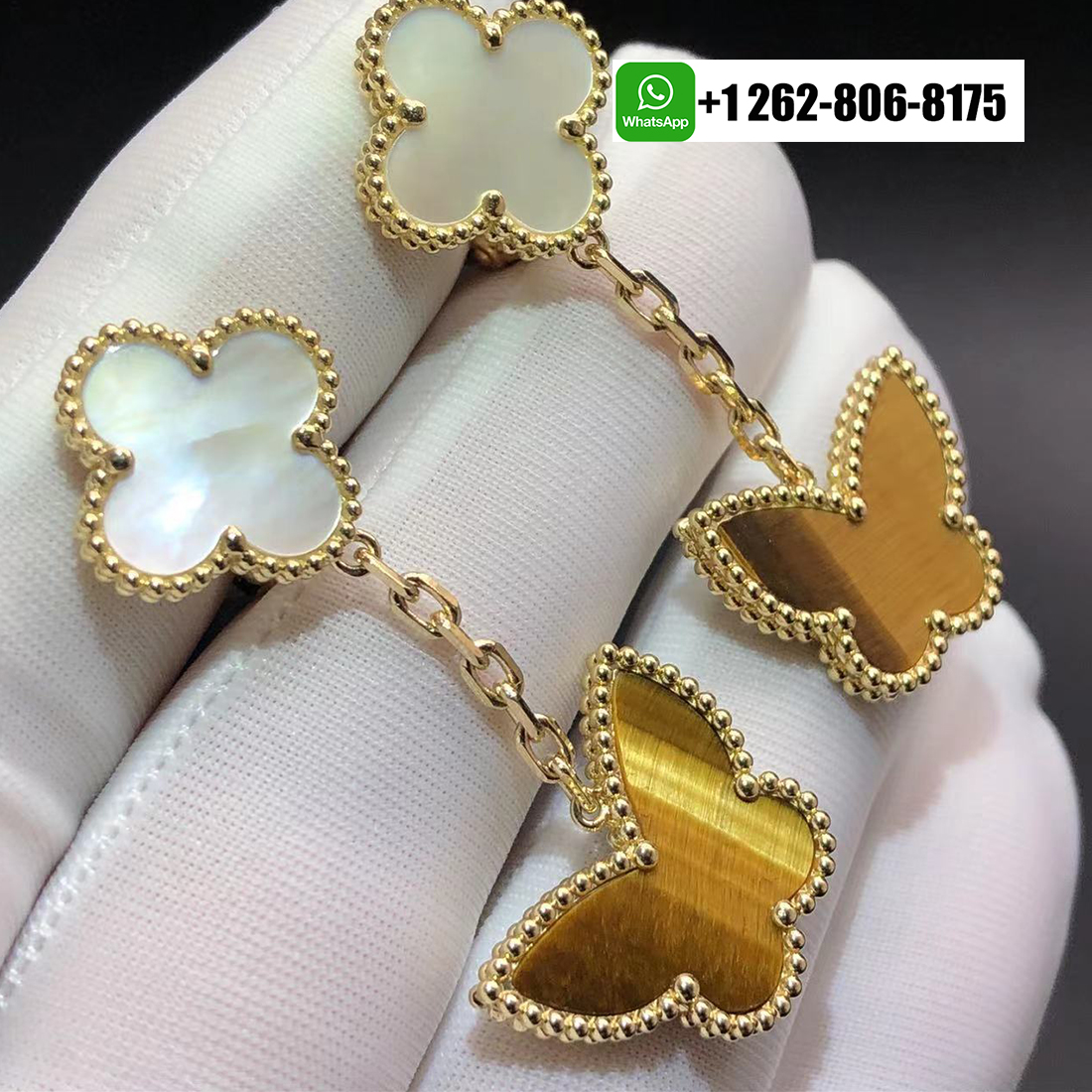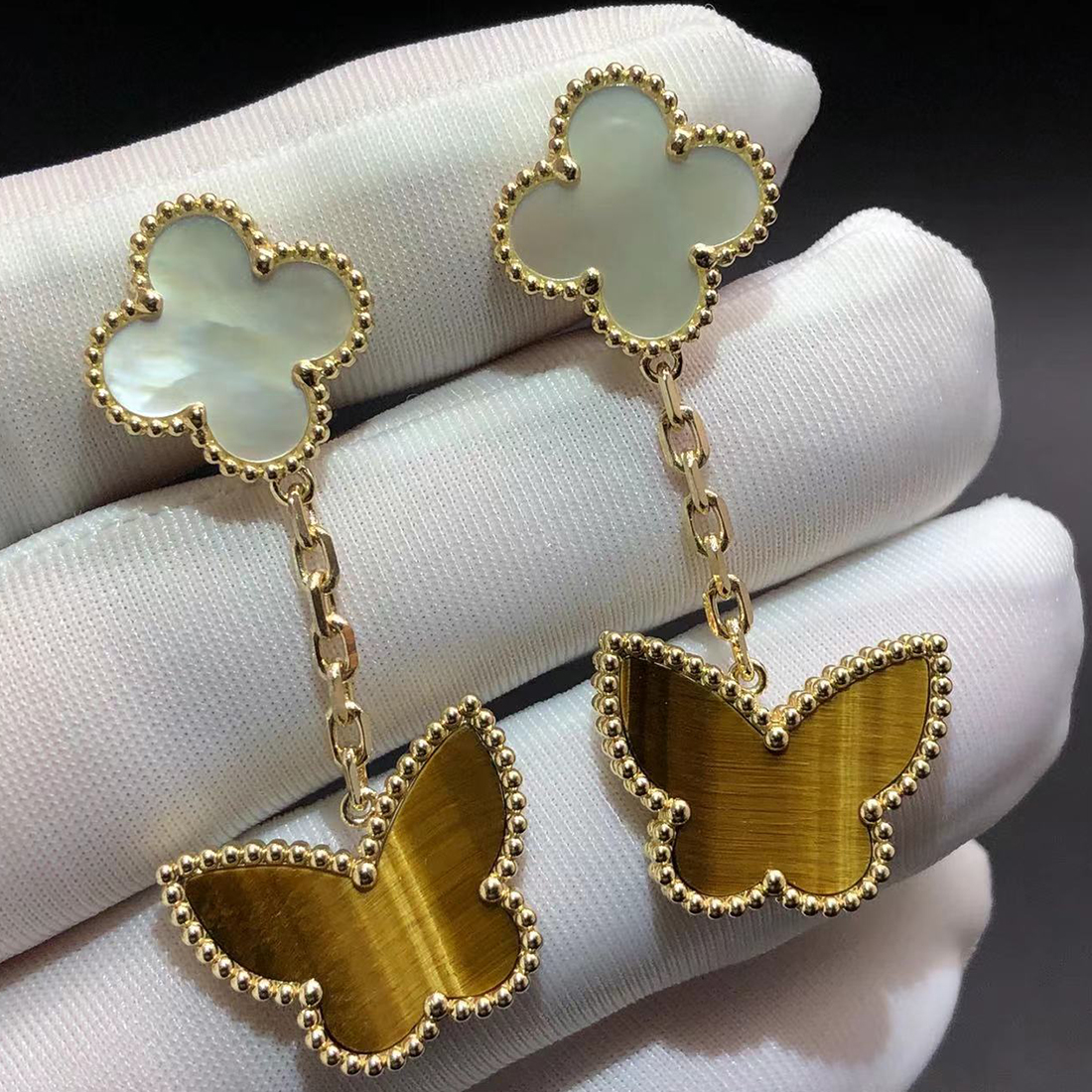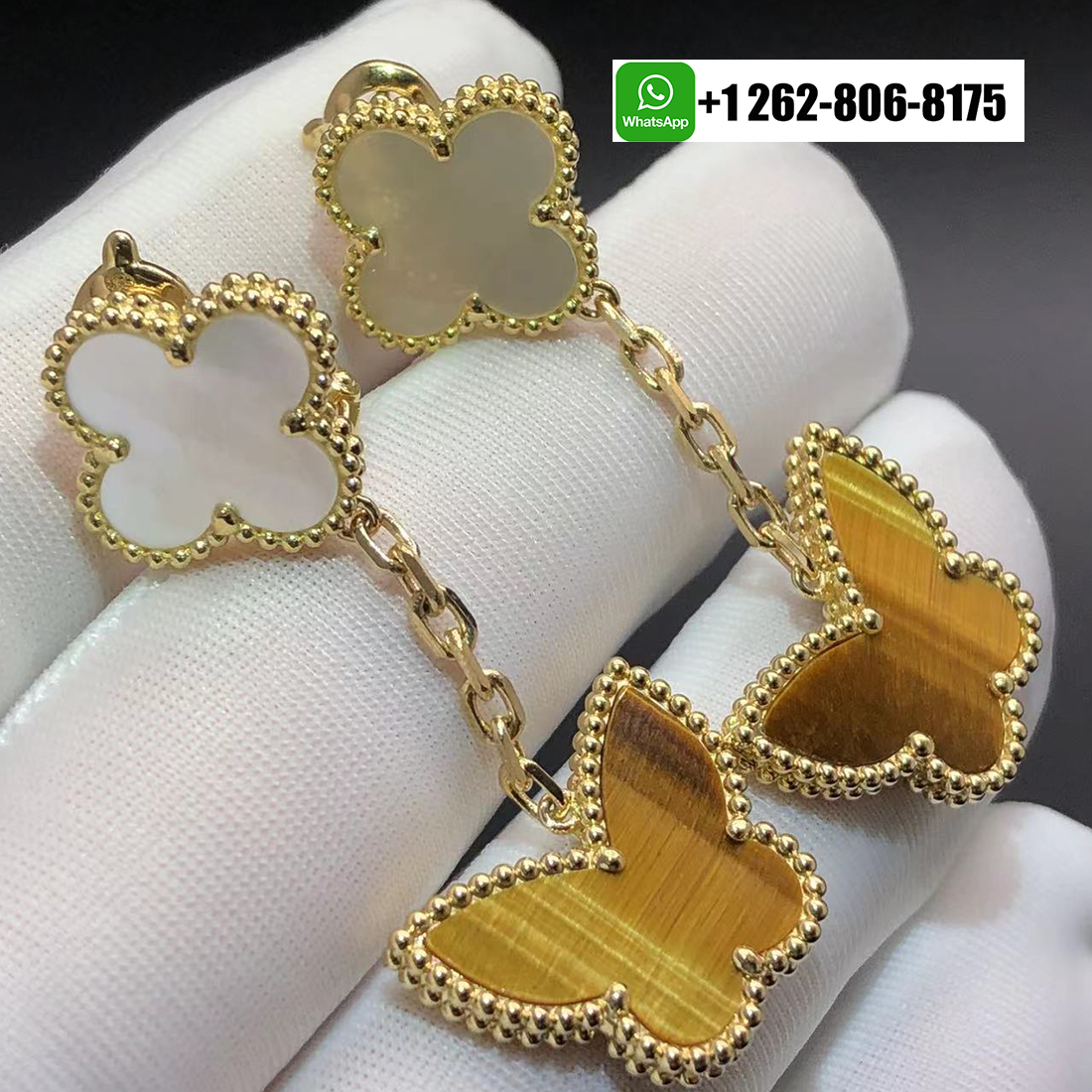These exquisite Van Cleef & Arpels Lucky Alhambra earrings are masterfully crafted in luminous 18k yellow gold and feature a refined two-motif design. Each earring pairs a delicate mother-of-pearl Alhambra clover stud with a gracefully suspended tiger’s eye butterfly motif, both framed by the Maison’s signature beaded gold edging. The soft iridescence of mother-of-pearl contrasts beautifully with the warm, chatoyant tones of tiger’s eye, creating a harmonious and elegant composition that captures Van Cleef & Arpels’ timeless artistry and poetic charm.