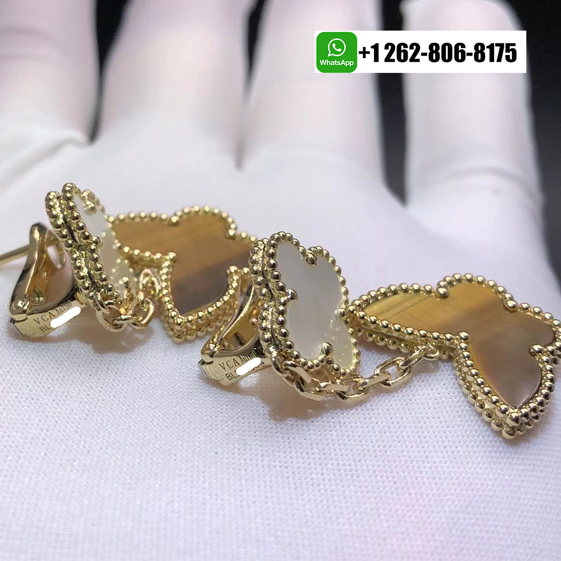 Van Cleef & Arpels Lucky Alhambra Mother of Pearl and Tiger Eye 2 Motifs Earrings 18k Yellow Gold VCARD79800