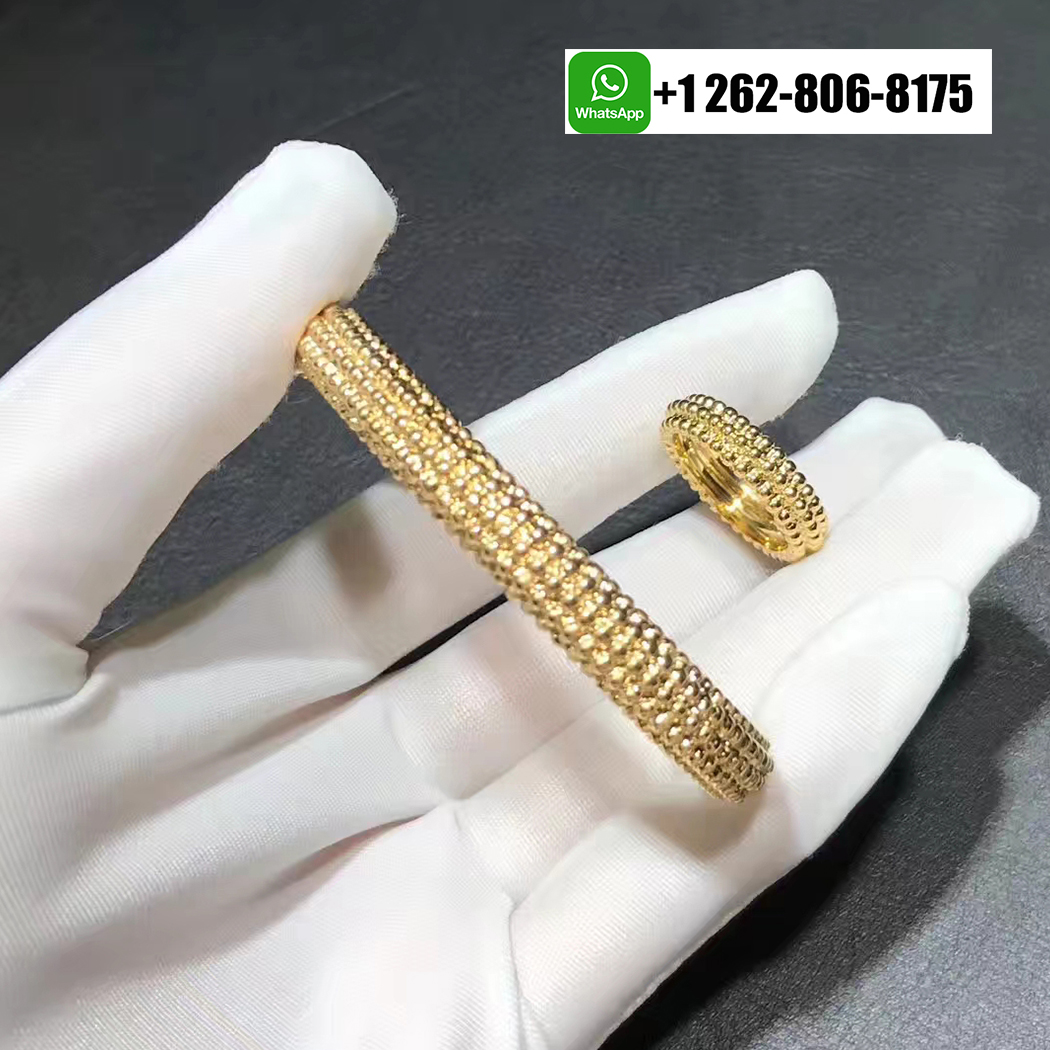 This exquisite Van Cleef & Arpels Perlee Pearls of Gold 5 Row Bracelet is crafted in solid 18K yellow gold, showcasing the Maison’s signature beaded motif. Five graceful rows of polished golden spheres create a rich, tactile texture that reflects light beautifully with every movement. Elegant yet contemporary, this bracelet is a timeless statement of refined luxury and impeccable craftsmanship.