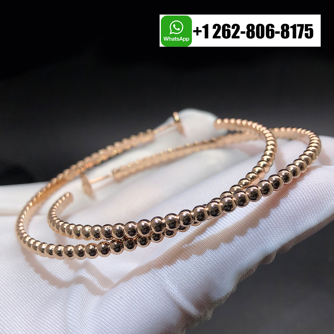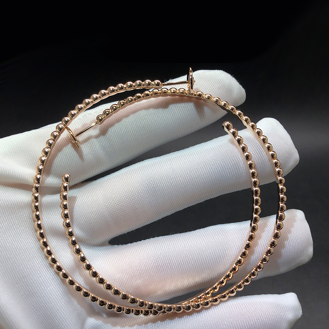 Crafted in 18k rose gold, the Van Cleef & Arpels Perlée Pearls of Gold Large Hoop Earrings turn the Maison’s beloved beaded motif into a striking, statement‑ready hoop. A generous circle of polished gold beads catches and reflects light from every angle—delivering dramatic shine without losing the collection’s refined, sculptural simplicity. The larger diameter frames the face beautifully, adding almost architectural presence to an otherwise classic hoop. Elegant for evening, bold enough for daytime, and effortlessly pairable with other Perlée pieces, these hoops embody Van Cleef & Arpels’ signature mix of timeless design and meticulous finish.