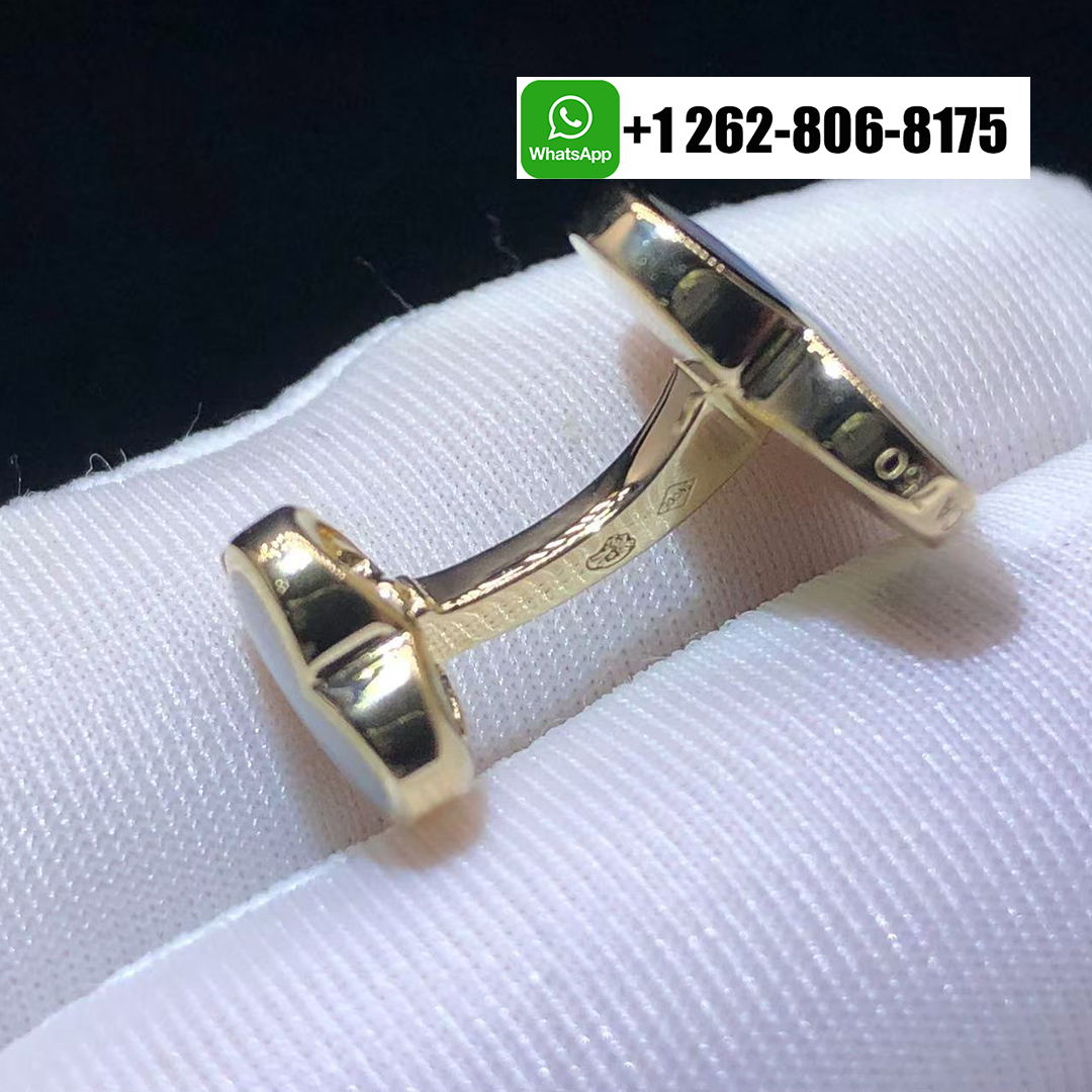 These Van Cleef & Arpels Pure Alhambra Cufflinks are crafted in 18K yellow gold, showcasing luminous mother-of-pearl clover motifs. The sleek design reflects timeless sophistication, with smooth polished edges that highlight the natural iridescence of the stones. Elegant and refined, these cufflinks add a touch of luxury and distinguished style to any formal attire.