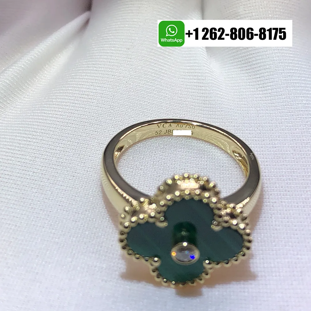 This Van Cleef & Arpels Vintage Alhambra Malachite and Diamond 18k Yellow Gold Ring highlights the iconic clover motif with vibrant malachite. Its rich green striations bring natural depth and character, beautifully framed by the maison’s signature beaded gold border. At the center, a brilliant-cut diamond adds luminous sparkle, enhancing the ring’s refined elegance. Radiant, symbolic, and artfully crafted, it is a timeless expression of luck and the artistry of Van Cleef & Arpels.