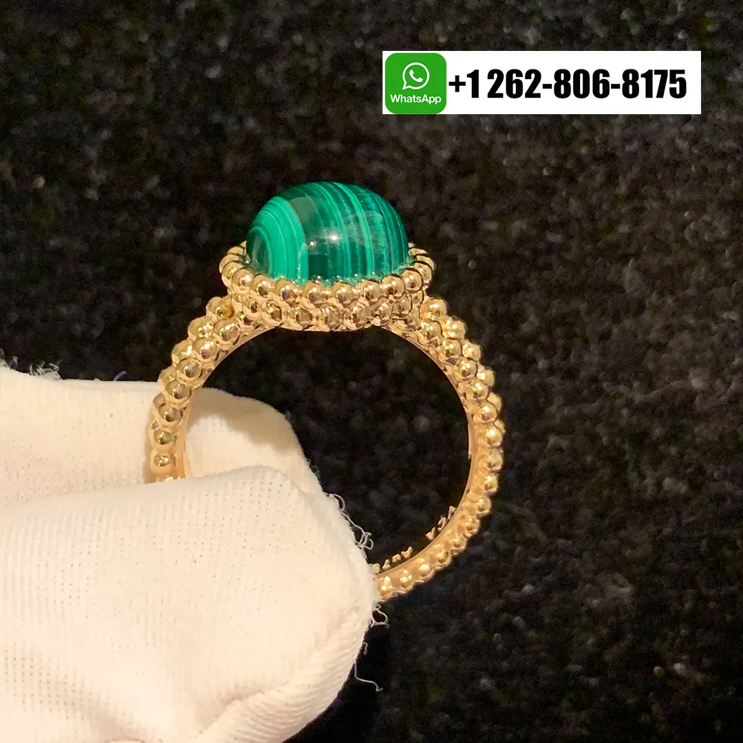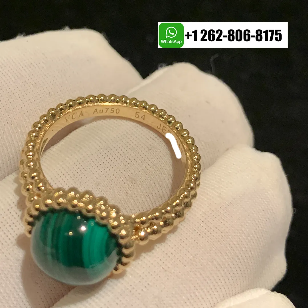 This Van Cleef & Arpels Perlée Couleurs Malachite Ring in 18K yellow gold radiates bold elegance with its striking green cabochon. The malachite’s natural banding adds depth and character, beautifully complemented by the Maison’s iconic beaded gold craftsmanship. Rich, vibrant, and effortlessly luxurious, this design brings a sophisticated touch of color and timeless refinement to any jewelry collection.